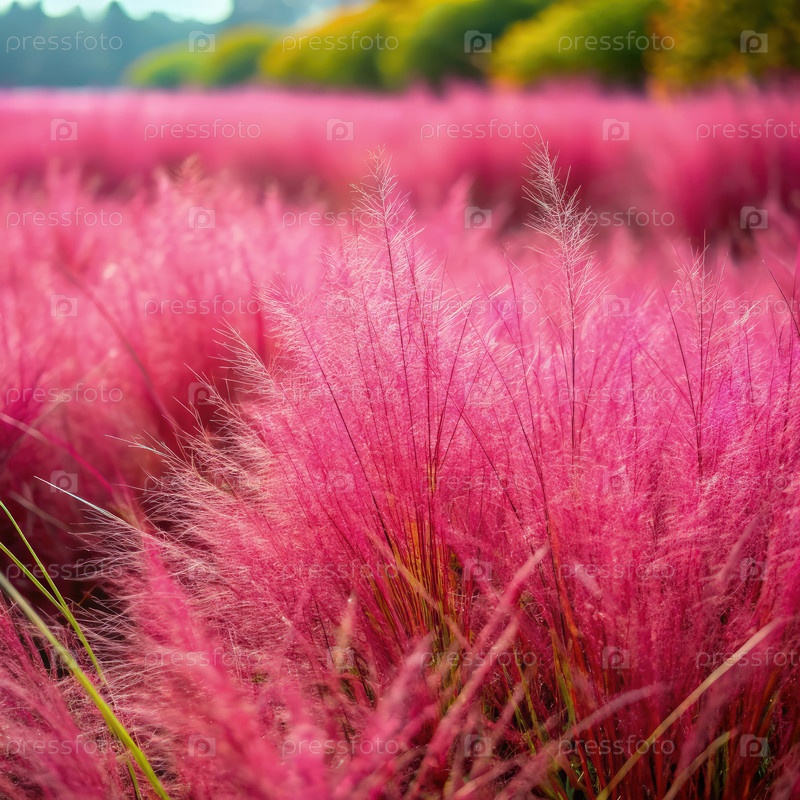 Поле розовой травы с деревьями. Мюленбергия волосовидная (Muhlenbergia capillaris) Генерирующий ИИ