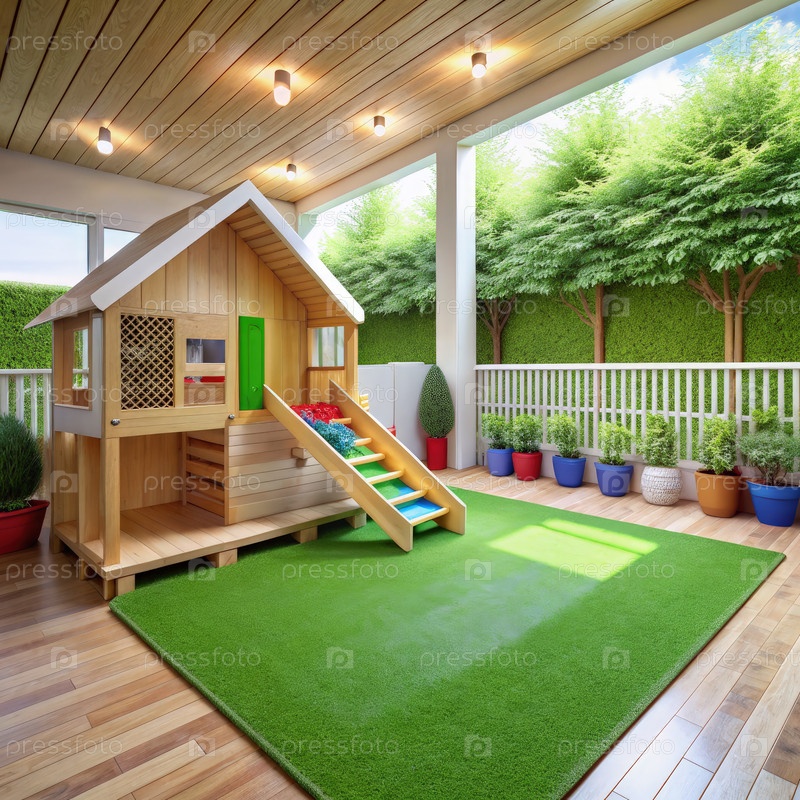 Детская игровая зона со слайдом и зеленым ковром