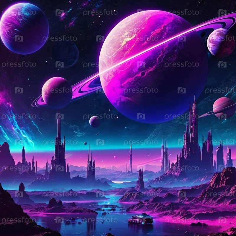 Футуристический город изображен на далекой планете с фиолетовым небом. В небе есть несколько планет, несколько падающих звезд, пересекающих сцену. Город имеет высокие, похожие на шпиль структуры. ИИ