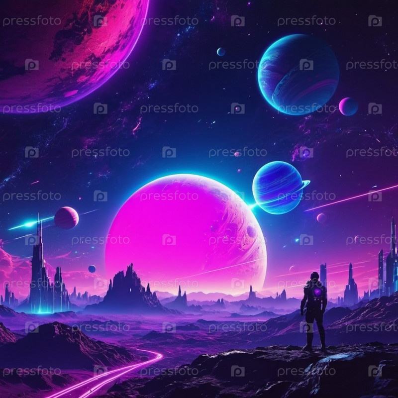 Футуристический город изображен на далекой планете с фиолетовым небом. В небе есть несколько планет, несколько падающих звезд, пересекающих сцену. Город имеет высокие, похожие на шпиль структуры. ИИ