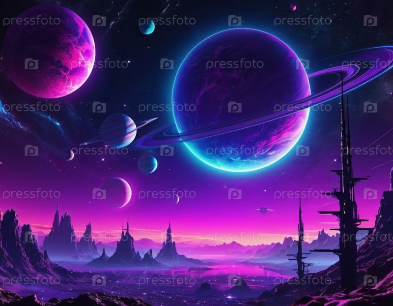 Футуристический город изображен на далекой планете с фиолетовым небом. В небе есть несколько планет, несколько падающих звезд, пересекающих сцену. Город имеет высокие, похожие на шпиль структуры. ИИ