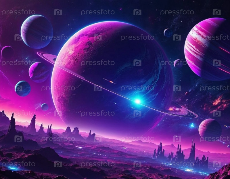 Футуристический город изображен на далекой планете с фиолетовым небом. В небе есть несколько планет, несколько падающих звезд, пересекающих сцену. Город имеет высокие, похожие на шпиль структуры. ИИ