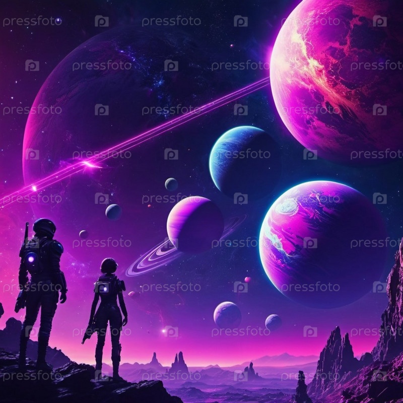 Астронавт стоит на скалистом обнажении, глядя на потрясающее инопланетное небо. Планеты светятся в оттенках розового, фиолетового и синего на темном, звездном фоне. Далекие футуристические структуры растут в ландшафте