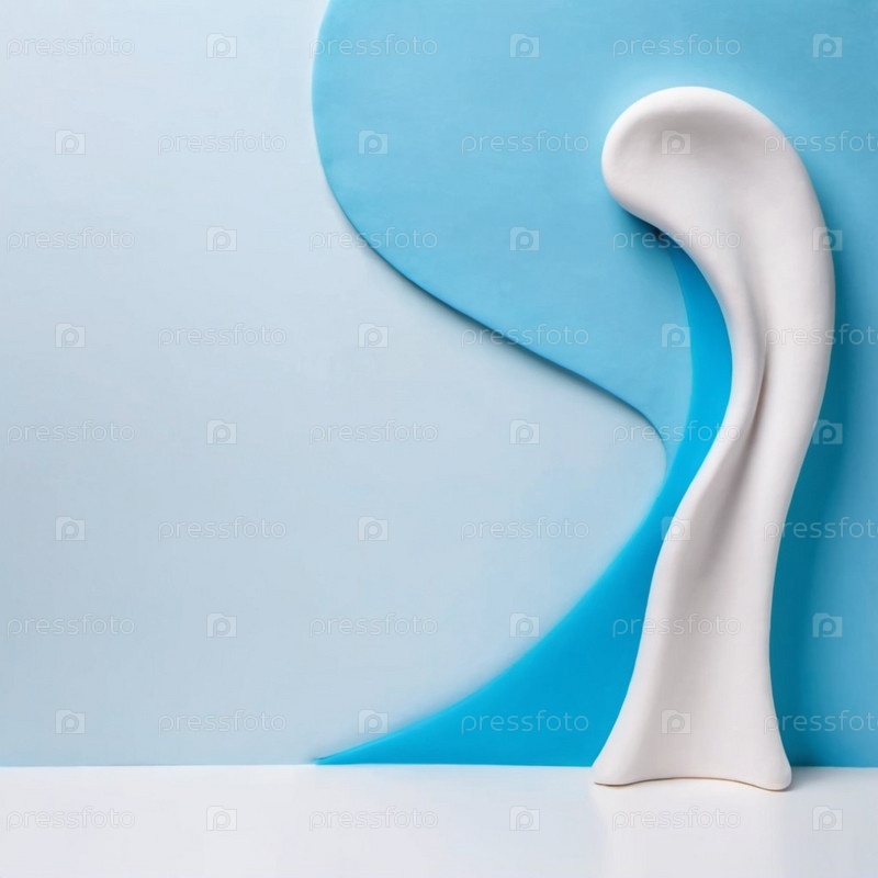 Белая органическая скульптура стоит на фоне двух синих волнистых форм. Скульптура высокая узкая с закругленной вершиной. Синие формы абстрактны и контрастируют с белой скульптурой. ИИ
