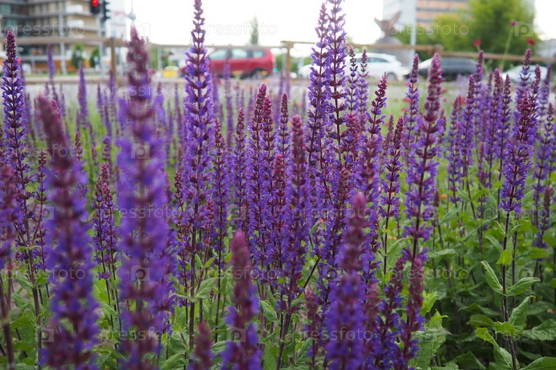 Утро в Будапеште, Венгрия. Газон рядом с дорогой. Машины ездят быстро. Sage Salvia — крупный род многолетних травянистых растений, кустарников семейства Lamiaceae. Мудрец Салвия Пратенсис. Фиолетовые цветы