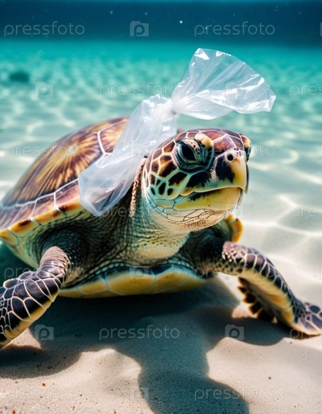 Морская черепаха поймана в пластиковый пакет на песчаном пляже недалеко от океана. Его тело лежит на песке. Изображение подчеркивает опасность пластикового загрязнения в океане и необходимость защиты окружающей среды. генерируемый