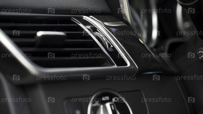 Детали интерьера роскошного автомобиля. Спидометр и руль. Сток. Воздушный обогреватель в салоне приборной панели автомобиля закрывается