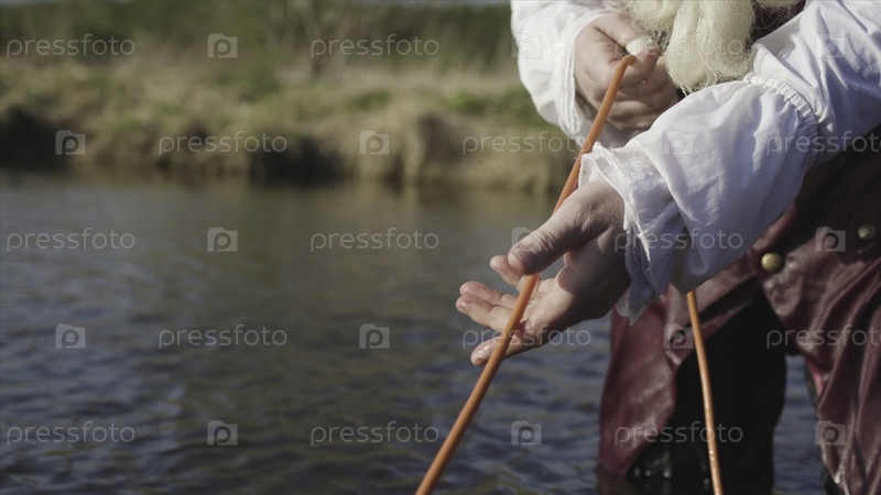 Древняя техника рыбалки, рыбак в старомодном костюме получает рыболовную сеть. Сток. Мужчина в старой одежде рококо манерой тянет рыболовную сеть, стоя в реке в солнечный день