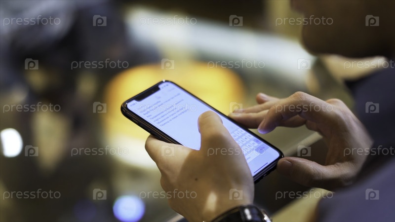 Закрыт человек, держащий устройство и читающий текст на экране, концепт современных технологий. Мужчина в темно-синей рубашке и черных часах на запястье держит свой смартфон