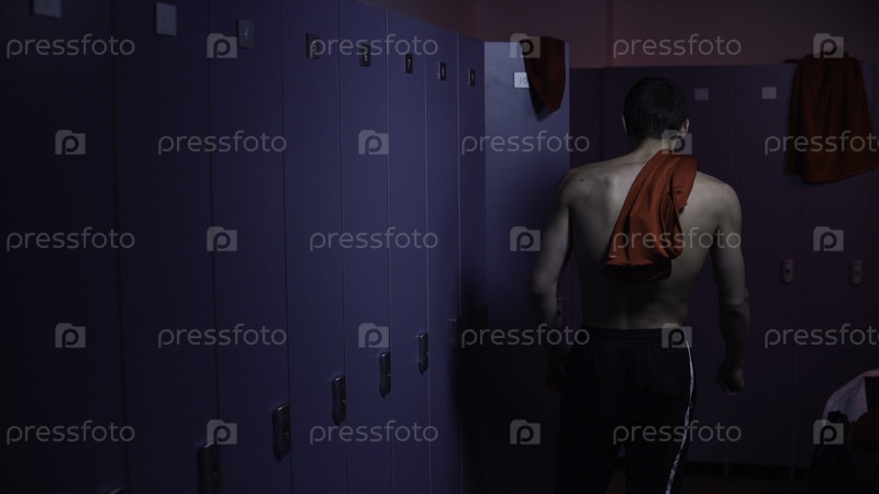 Разочарованный и уставший спортсмен в полуосвещенной раздевалке. Печальный спортсмен в раздевалке после поражения на турнире