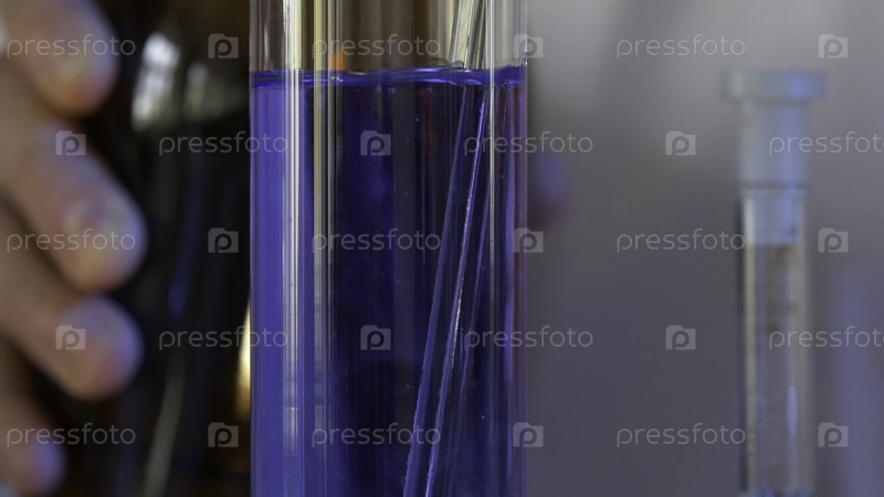 Ученый вкладывает химические вещества синего образца во фласк. Здравоохранение и медицинская концепция. Ученые занимаются экспериментальными исследованиями, такими как смешивание химических веществ 4K
