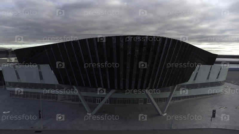 Большой черный стадион. Запасные кадры. Большой стадион против серого неба с облаками