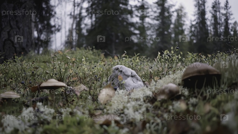 Грибы в лесу. КЛИП. Глэйд с грибами и травой. На лугу выросло несколько коричневых грибов. Рождественские елки растут на заднем плане