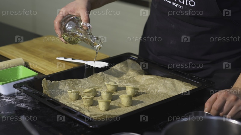 Повар помещает приготовленные пельмени из кастрюли в белую тарелку. Арт. Человек добавляет в тарелку готовое блюдо с коландером