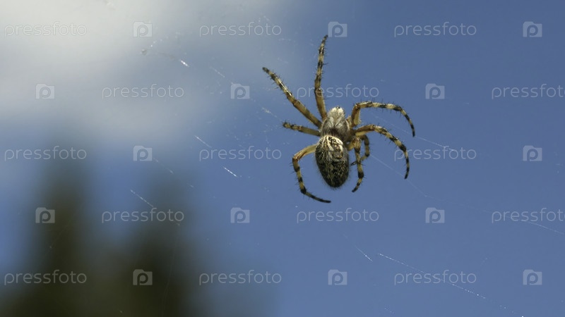 Большой красивый паук лазает по паутине. Творческий. Паук в сети с жертвами в солнечный день на лугу. Дикий паук на голубом фоне неба. Макрокосм летнего луга