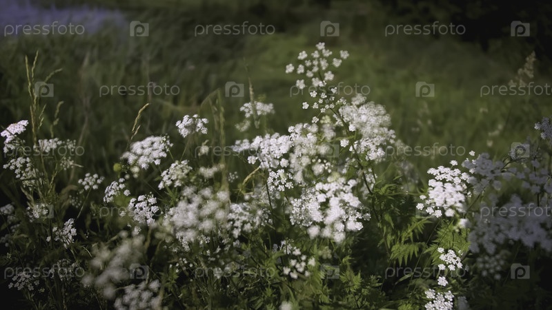 Красивая ромашка растет в поле и на ней ползают насекомые. Креатив. Цветок с белыми лепестками и желтым центром. Насекомые на цветке. Ветер дует цветком, растущим на поляне