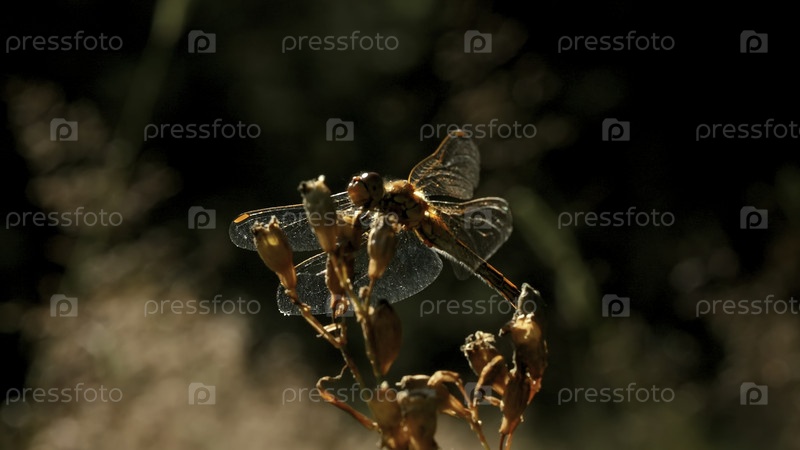 Насекомые в макрофотографии. Творческий. Маленькие цветы, на которых стрекозы и кузнечик сидят и шевелит усами, а на них светит солнце. Качественные 4k кадры
