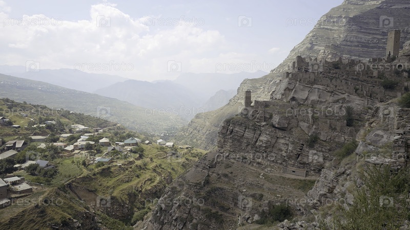Вид с воздуха на древний заброшенный разрушенный город. Действуй. Пролетая над старыми каменными зданиями, построенными на склоне горы