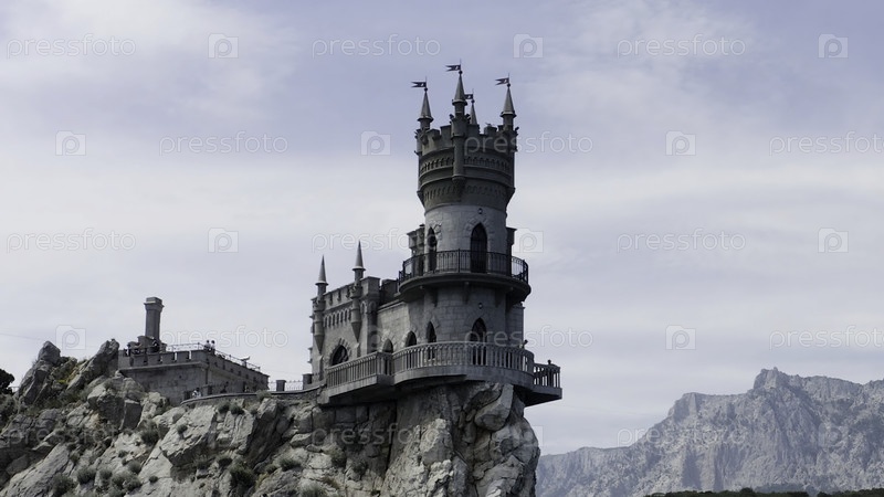 Вид с воздуха на удивительное гнездо Ласточки в Гаспре в Крыму, Россия. Действуй. Сказочный замок построен на вершине скалы с зеленой долиной и голубым небом на заднем плане