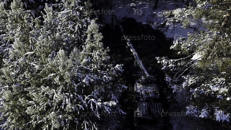 Восточно-сибирская тайга зимой. Вид с дрона. Клип. Оборудование работает в зимнем лесу с замороженными елками