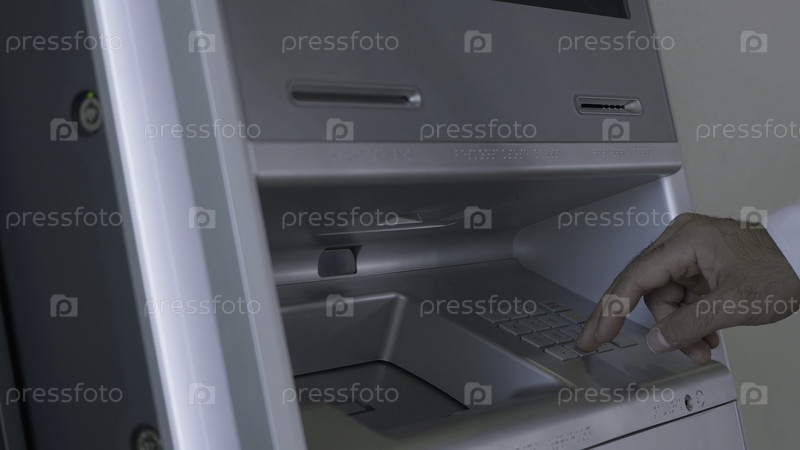 Мужская рука вводит пин-код на клавиатуре банкомата, снимая деньги со счета. HDR. Автоматическая машина для снятия наличных