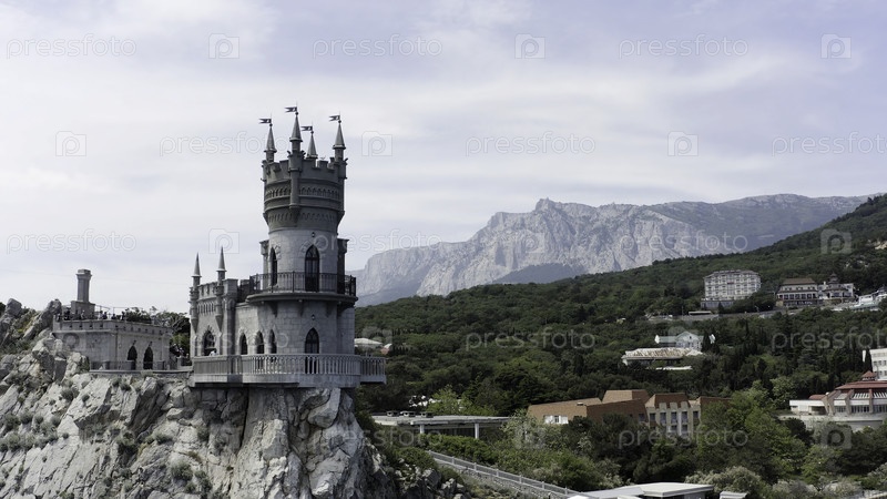 Вид с воздуха на удивительное гнездо Ласточки в Гаспре в Крыму, Россия. Действуй. Сказочный замок построен на вершине скалы с зеленой долиной и голубым небом на заднем плане