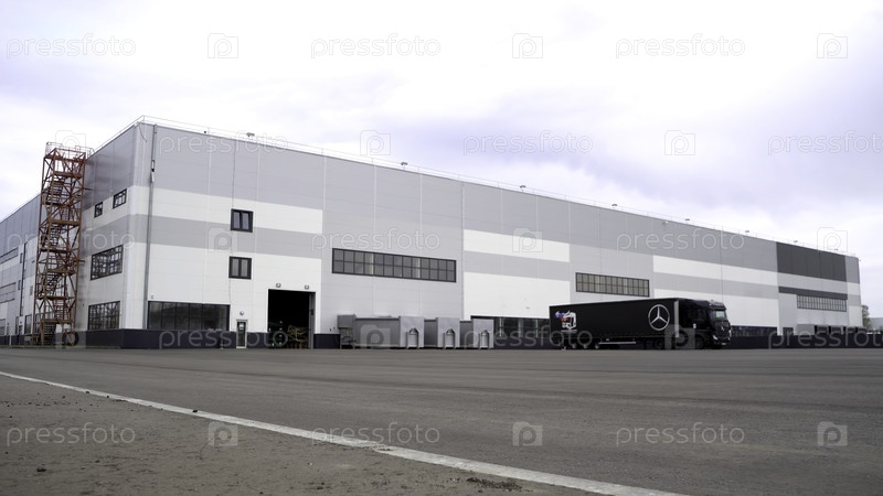 Окло - Норвегия, 11.20.2021: новый посудный дом Mercedes benz с припаркованным грузовиком. Сцена. Большой грузовой автомобиль стоит у нового здания на облачном фоне неба