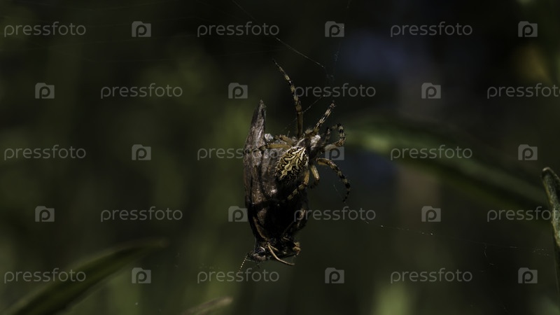 Паук пытается поднять крупное насекомое. Творческий. Маленький паук, запутавшийся в своей паутине, пытается поднять огромное темное насекомое