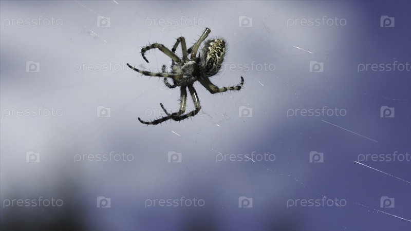 Закрыть паука в паутину на размытом голубом фоне неба с облаками. Творческий. Процесс создания паутины насекомым, концепция дикой природы