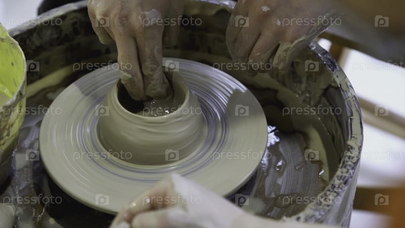 Руки ребенка на гончарном колесе лепят горшок. Арт. Руки взрослого и ребенка крупным планом занимаются керамикой на фестивале