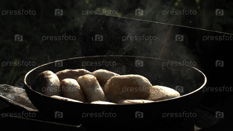 Пикник на улице. Творческий. Большая кастрюля, на которой жарится вкусное мясо и идет дым, котлеты делаются на природе