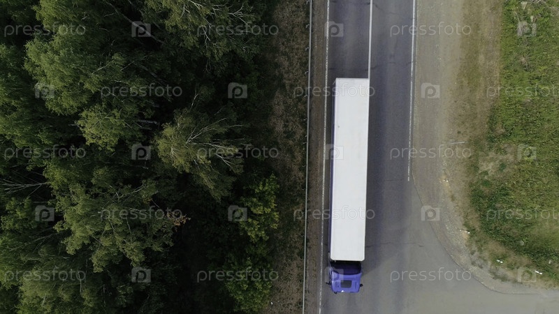 Вид с вертолета. Сцена. Узкая дорога, по которой едут грузовой автомобиль с синим фронтом и автомобиль с прицепом для перевозки, есть лес и дорога с травой рядом