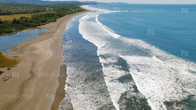 Вид с воздуха на длинный песчаный пляж с бирюзовыми океанскими волнами