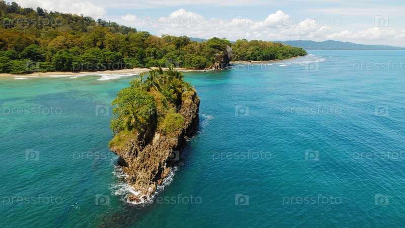 Скалистый пальмовый островок у пышного тропического побережья Карибского моря в Коста-Рике