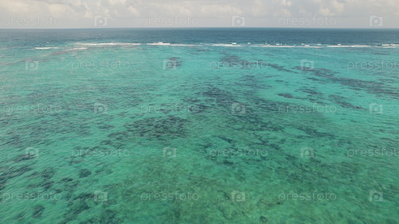 Чистый мелкий океан с коралловыми пятнами, видимыми через бирюзовую воду сверху