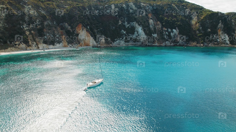 Парусная лодка, плавающая в яркой бирюзовой воде возле крутых скалистых прибрежных скал