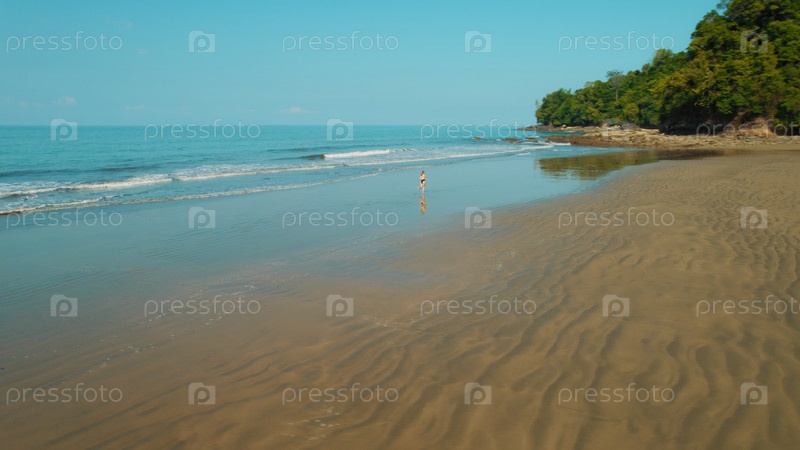 Одинокая женщина-бегун пересекает широкий песчаный отражающий пляж в Коста-Рике в утреннем свете