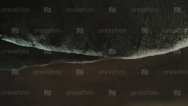 Вид с воздуха на черный песчаный пляж с пенистыми волнами, образующими узоры на берегу