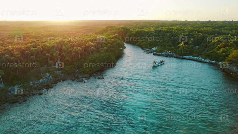 Лодка, курсирующая по спокойной бирюзовой лагуне на закате в Мексике