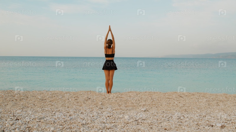 Женщина смотрит на горизонт, гуляя по тихому галечному пляжу со спокойным бирюзовым морем
