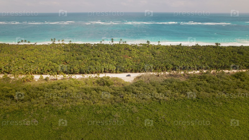 Пара стоит возле автомобиля на грунтовой дороге в джунглях с океаном, видимым на заднем плане