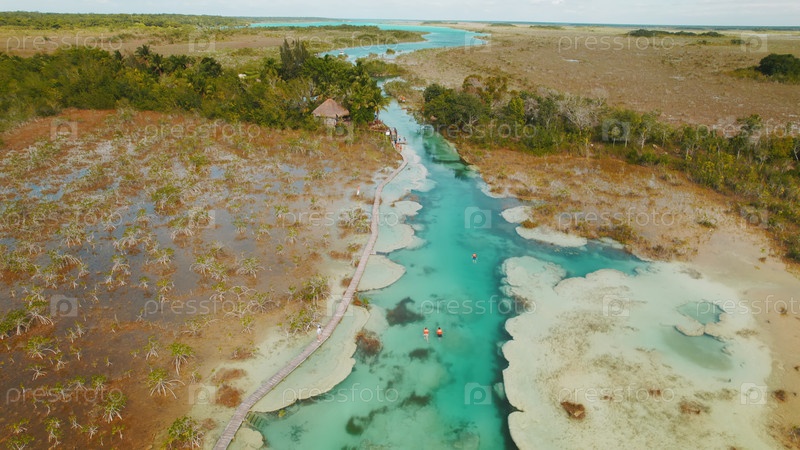 Туристы плавают в прозрачном синем канале Бакалар возле мангрового леса в Мексике