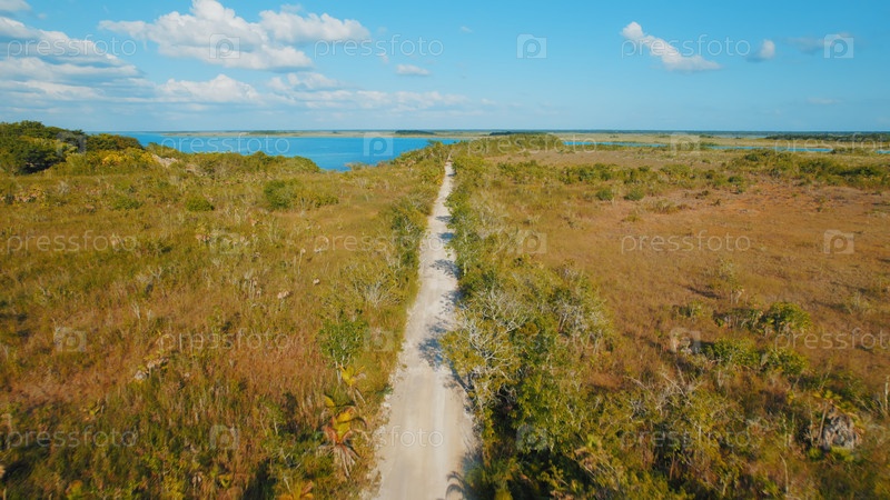 Грязная дорога, ведущая в Лагуну Бакалар Семи Цветов по зеленому лесу в Мексике