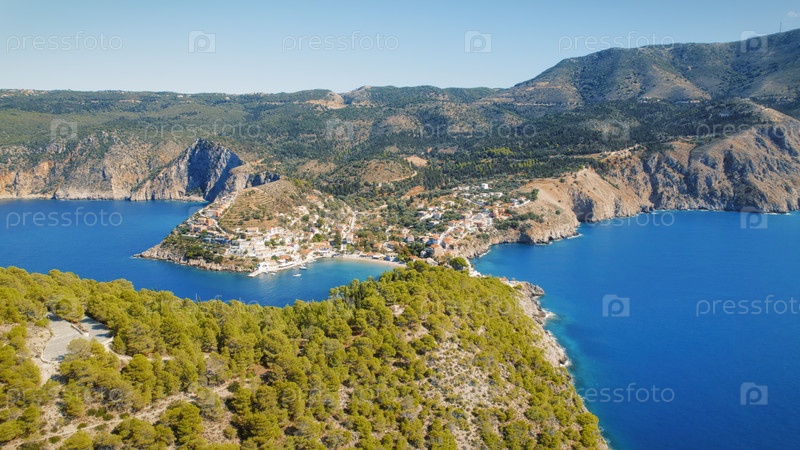 Живописная прибрежная деревня, окруженная горами на острове Кефалония летом