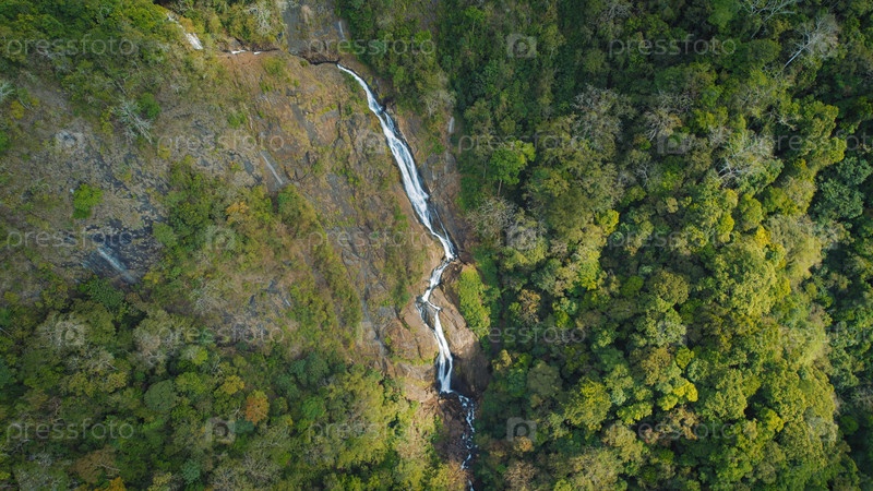 Высокий сегментированный водопад, каскадирующий вниз по скалистому утесу в вечнозеленом лесу Коста-Рики
