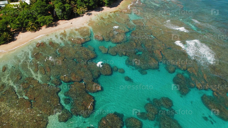 Вид с воздуха на коралловый риф и песчаный пляж вдоль побережья Коста-Рики ясным теплым утром