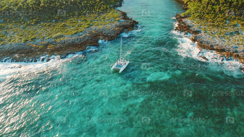Катамаран, плавающий по бирюзовому каналу вдоль тропического побережья Юкатана, Мексика