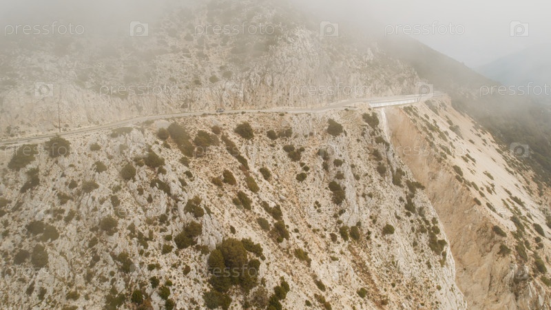 Автомобиль едет по извилистой горной дороге через туман на острове Кефалония в Греции