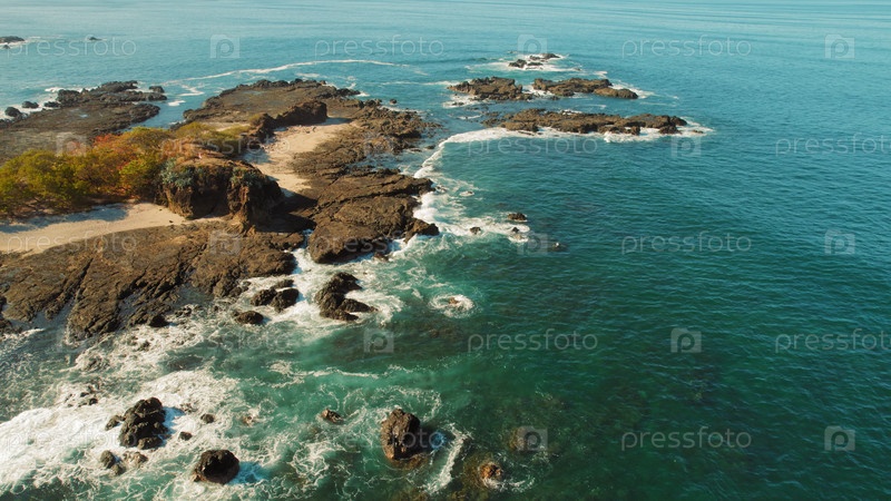 Скалистая береговая линия окружена бирюзовой водой и небольшими песчаными пляжами сверху