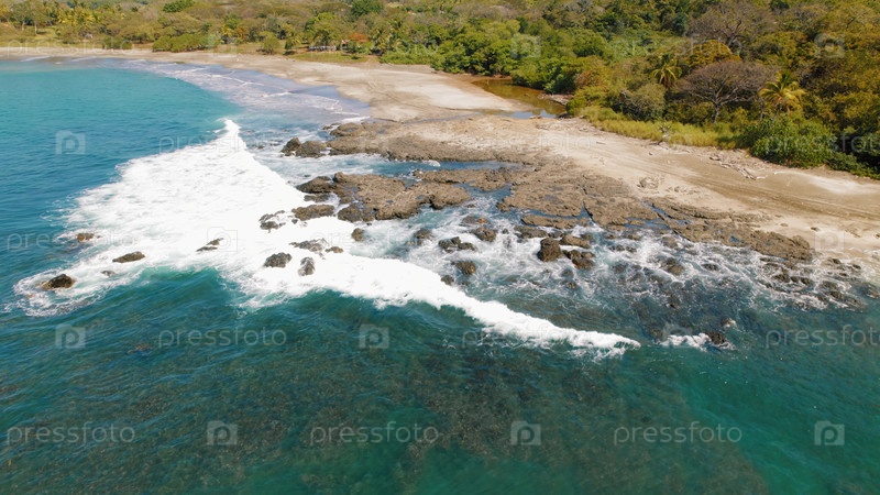 Воздух тропического пляжа с бирюзовой водой и песчаной береговой линией в Коста-Рике